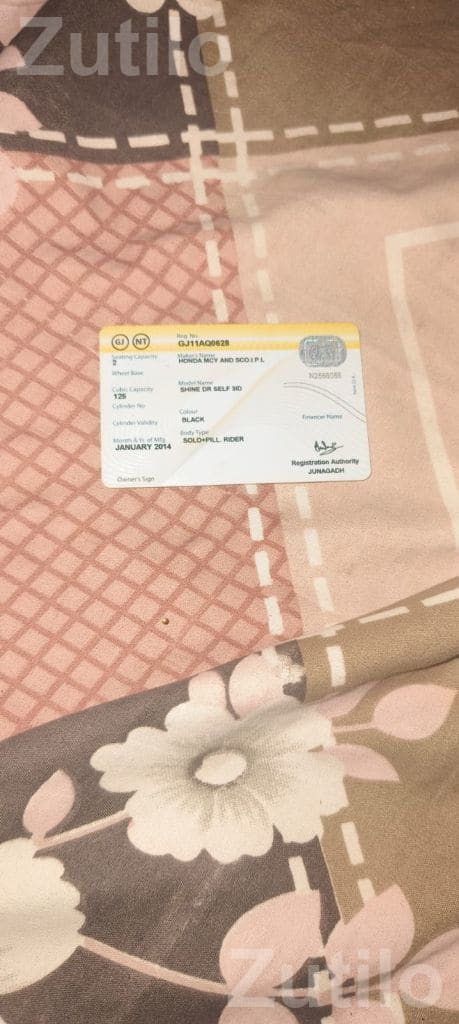 સાઈન Honda Shine 2014 bike available for sale. The image shows a registration card for a Honda Shine in black colour with January 2014 registration. Suitable for buyers searching for a used Honda Shine motorcycle. હોન્ડા શાઇન 2014 બાઈક વેચાણ માટે ઉપલબ્ધ છે. તસવીરમાં કાળા રંગની હોન્ડા શાઇનનું રજિસ્ટ્રેશન કાર્ડ દેખાય છે, જેમાં જાન્યુઆરી 2014 રજિસ્ટ્રેશન દર્શાવાયેલ છે. યુઝ્ડ હોન્ડા શાઇન મોટરસાયકલ શોધતા ખરીદદારો માટે યોગ્ય છે.